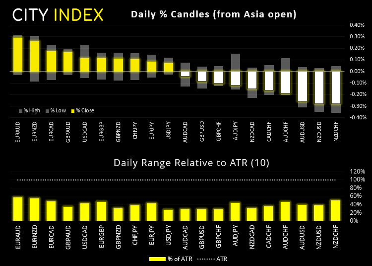 亚洲PMI指数全线走软,受服务业拖累,澳大利亚综合指数自前值58.9降至58.1。日本制造业PMI预览值同样走低,自53.6降至52.5。如果欧洲和美国持续这一趋势(有时如此),那么本周收盘可能略显平淡,虽然股市正努力尝试收复早前失地。但由于通胀似乎没那么令人担忧(至少今天如此),市场可能对积极数据喜闻乐见,从而助力提振各自股市表现。截至撰写本文时,欧洲和美国市场开盘小幅走高,表明本周结束时的情况可能优于周初。