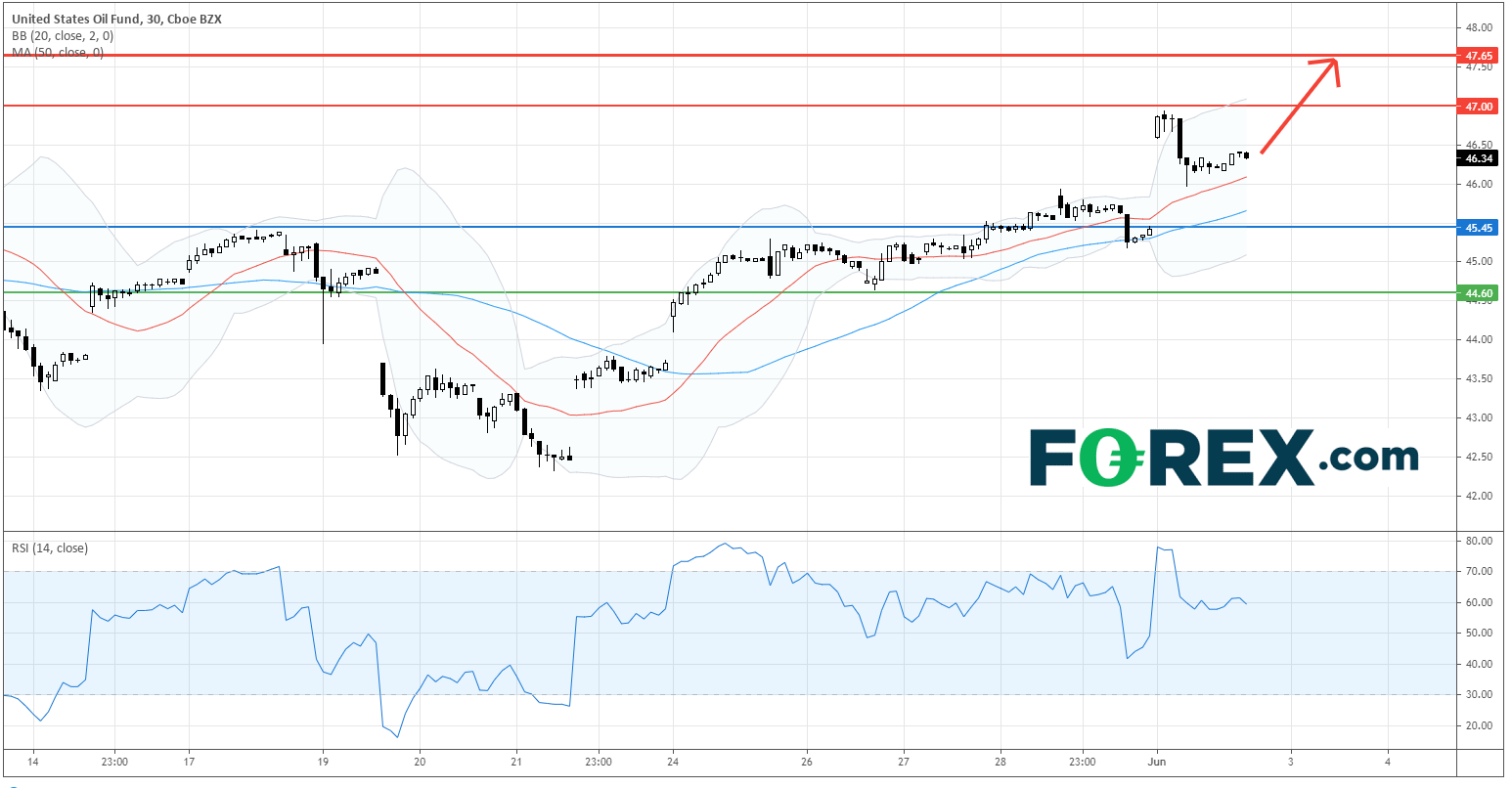 美国石油基金 (USO.US) : 上行動能強勁,料升至47.65美元